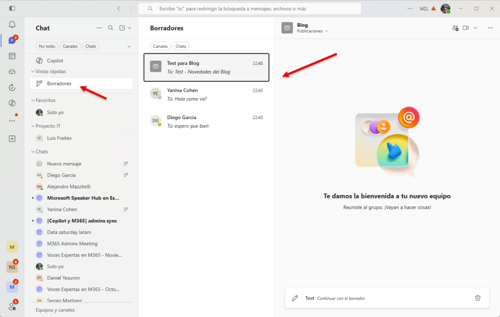 Cuantas veces uno empieza a escribir un mensaje a un contacto o en un canal y no termina de redactarlo y luego no se sabe por donde seguir? La nueva vista rápida de borradores facilita encontrar, editar y enviar mensajes de borrador a través de chats y canales. No más buscar en conversaciones para encontrar ese pensamiento a medio terminar. Tus borradores ahora están disponibles en un solo lugar cómodo, ayudándote a completarlos y enviarlos cuando estés listo.