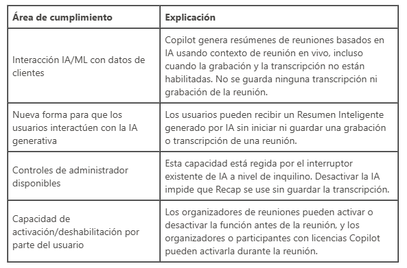 Esta funcionalidad está diseñada para organizaciones que desean aprovechar las capacidades de resumen de la IA pero cuentan con normativas internas que restringen o impiden la retención de transcripciones y grabaciones. En caso de que la opción esté desactivada, Copilot no producirá ningún resumen. Las licencias de Copilot ya existentes y los controles de IA configurados a nivel de inquilino continúan vigentes sin modificaciones.